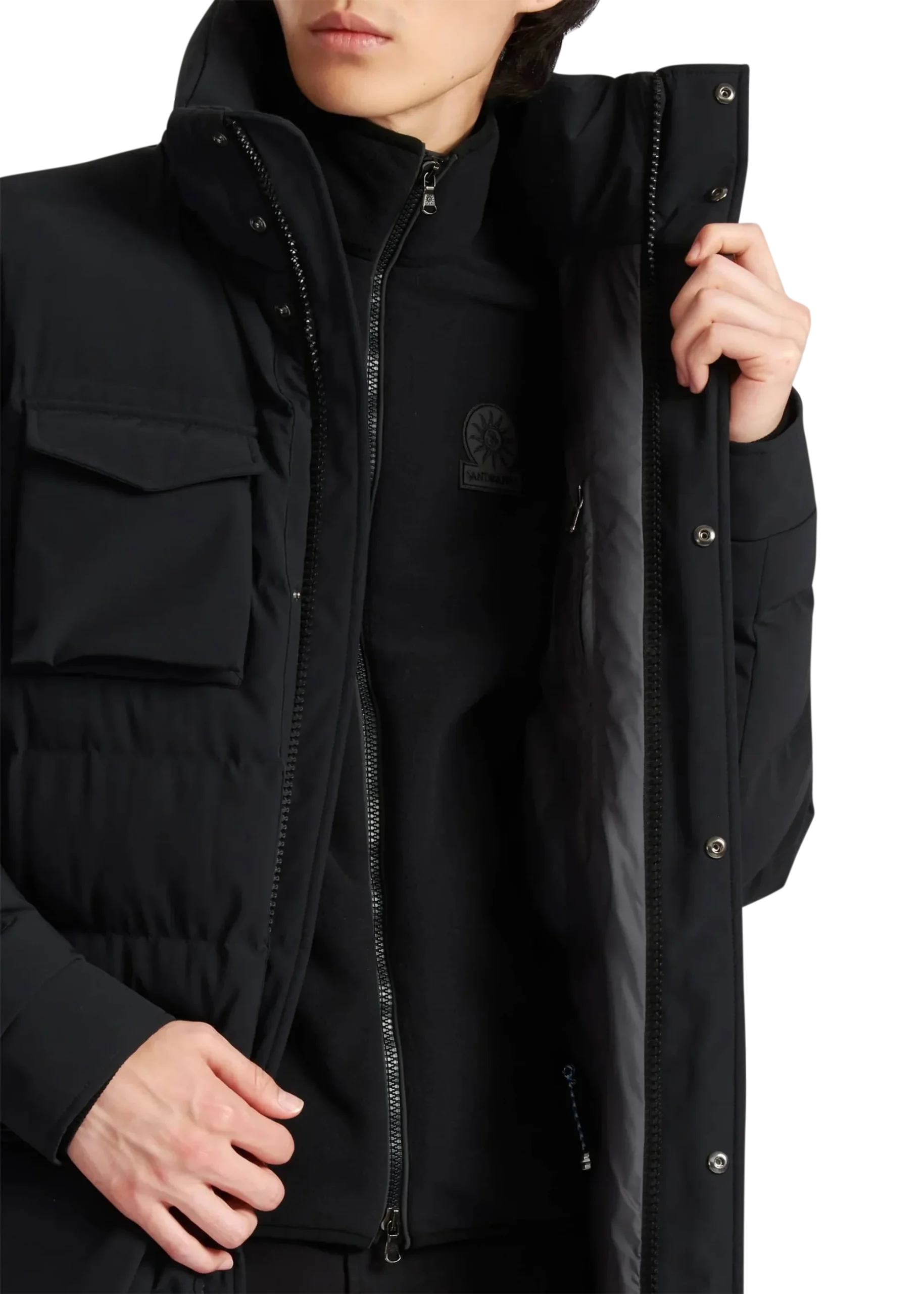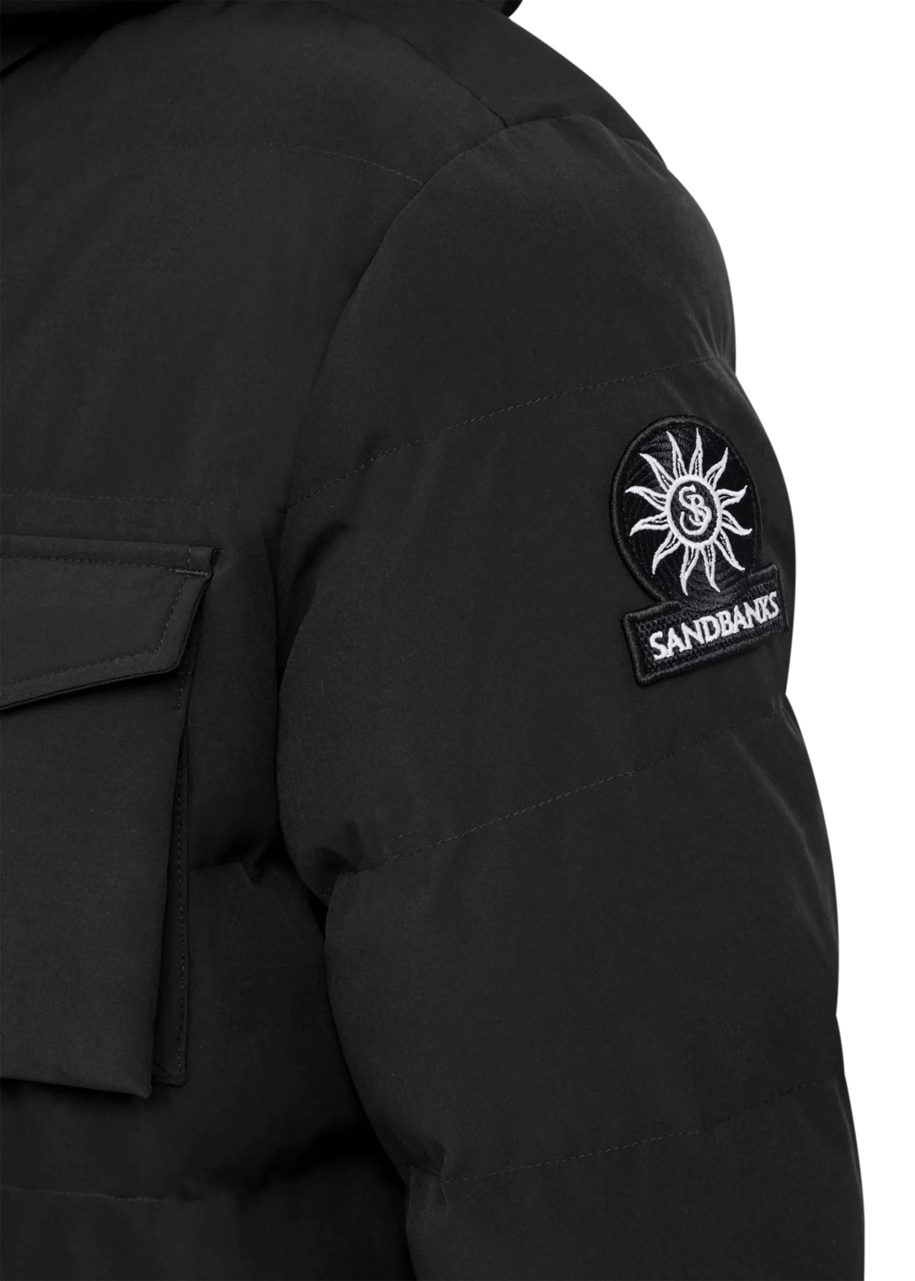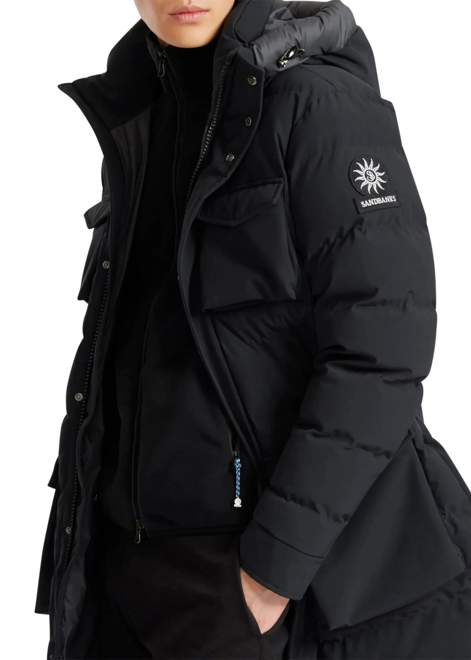 Finished with a detachable hood, high-neck collar, and buttoned wind placket, the jacket includes fleece-lined pockets, internal and concealed arm zip pockets, ribbed inner cuffs, and premium gunmetal two-way Lampo zips. An embroidered Sandbanks arm badge and brushed metal hardware complete the look.