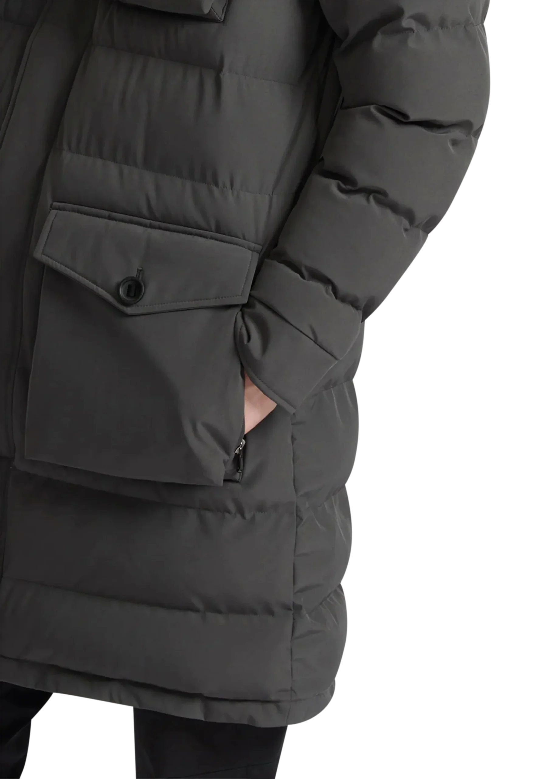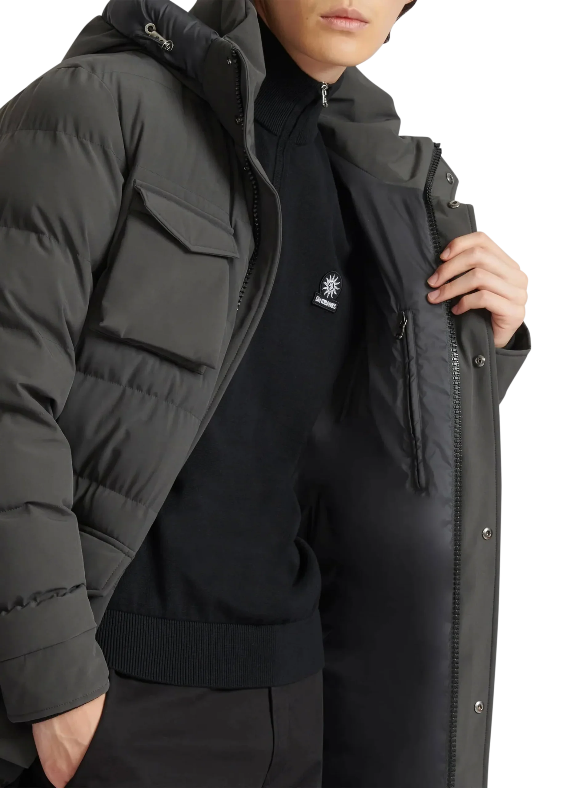 Finished with a detachable hood, high-neck collar, and buttoned wind placket, the jacket includes fleece-lined pockets, internal and concealed arm zip pockets, ribbed inner cuffs, and premium gunmetal two-way Lampo zips. An embroidered Sandbanks arm badge and brushed metal hardware complete the look.