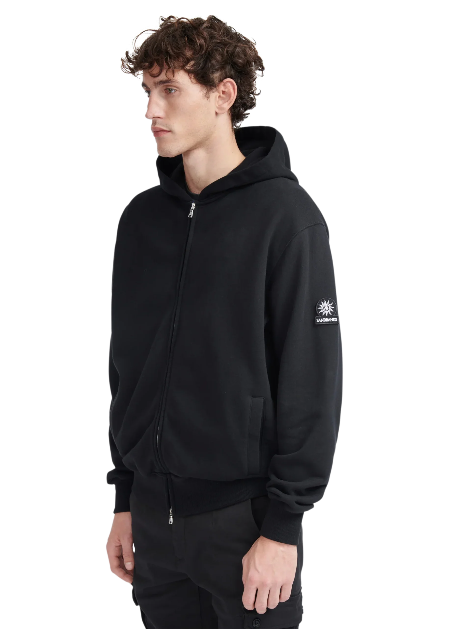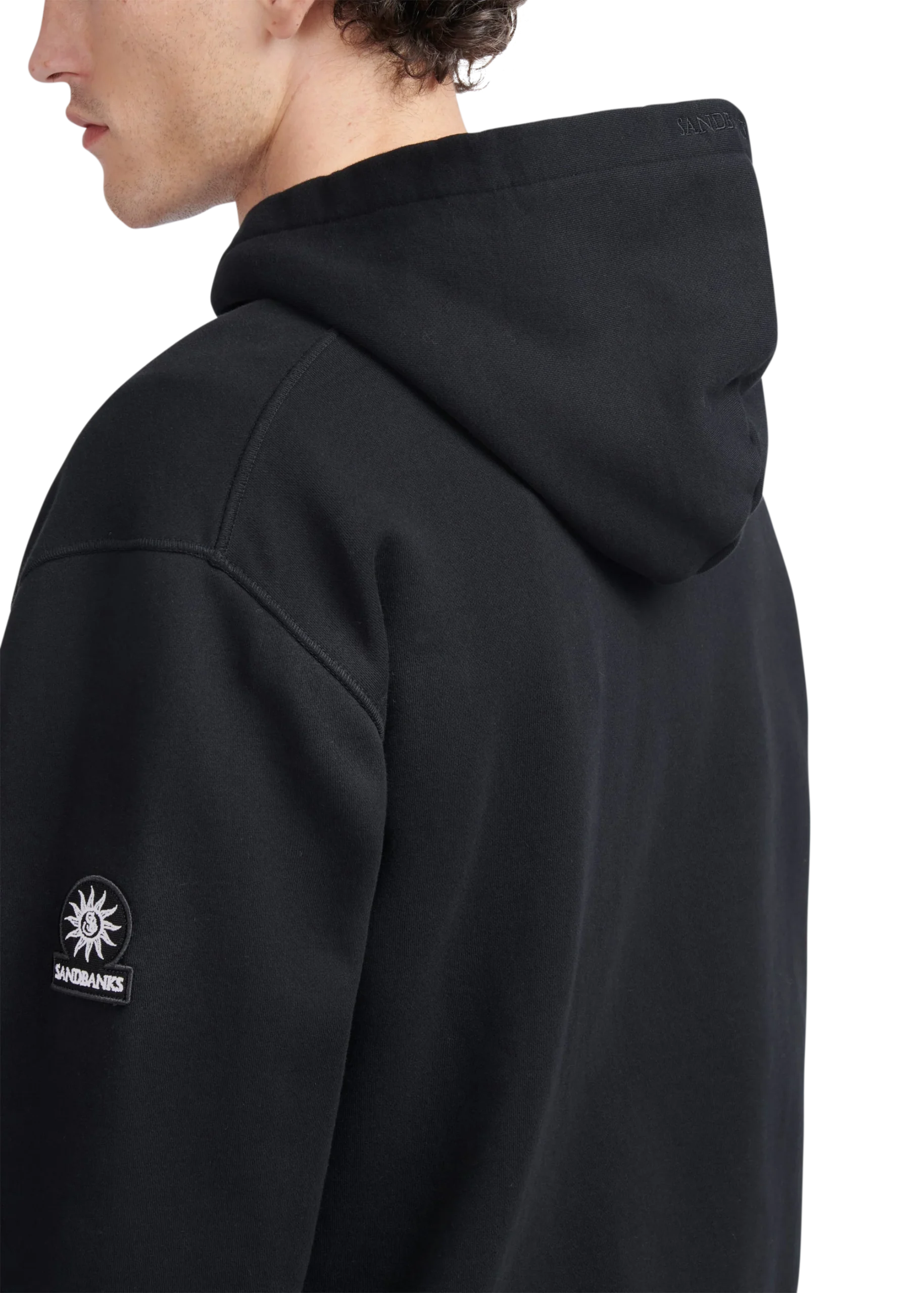 Sandbanks delivers a premium everyday layer with this badge logo zip hoodie, crafted from heavyweight 400gsm diagonal knit cotton for warmth, softness, and breathability. Finished with a lightly brushed interior, it offers a comfortable feel suitable for year-round wear. The design features a silver two-way Lampo zip with an engraved puller, tonal embroidery at the hood, and the signature Sandbanks badge logo at the sleeve. Detailed with cover-stitch construction, tri-colour neck binding, and ribbed cuffs and hem, this hoodie balances comfort with refined branding.